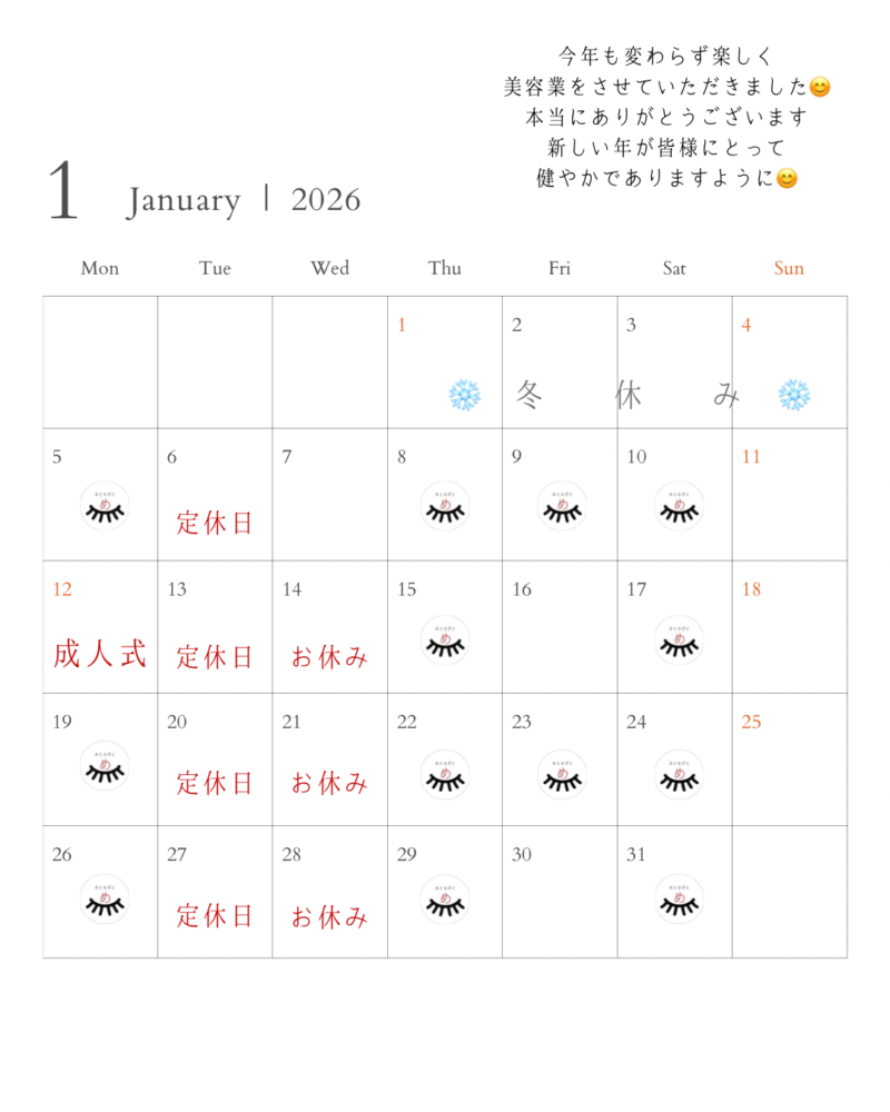 大人美人お知らせ ~1月のお休みのお知らせ~ Posted on 2026年1月7日 by Otonabito / 0件のコメント 🎍本年も大人美人を宜しくお願い申し上げます🎍また、ご不明な点等ございましたら、営業日のご来店またはご連絡をお願い致します。 今後とも大人美人を宜しくお願い申し上げます。 お知らせ Otonabito Otonabito の投稿をすべて表示