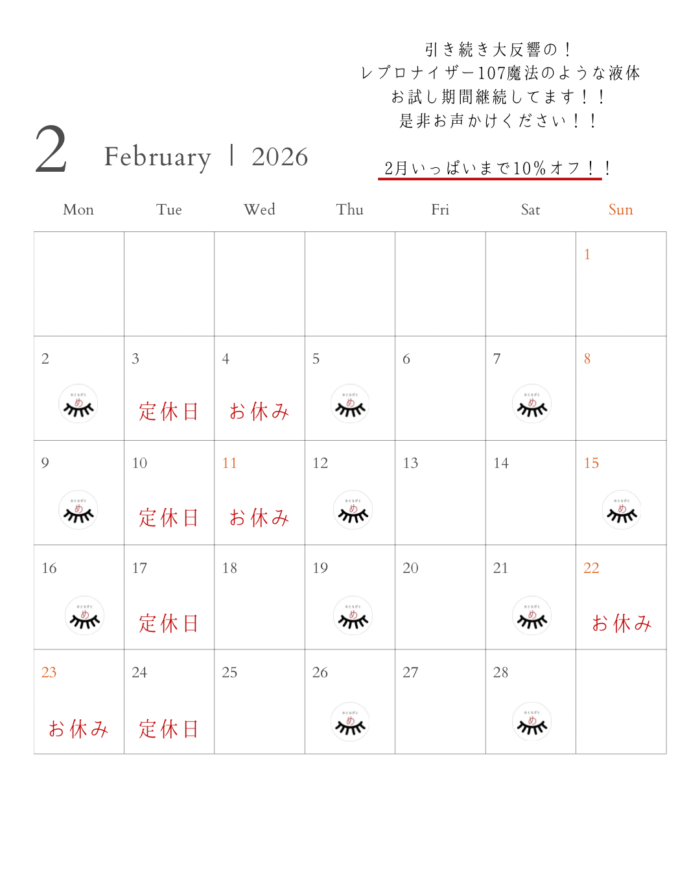 大人美人お知らせ ~2月のお休みのお知らせ~ Posted on 2026年1月30日 by Otonabito / 0件のコメント 寒い日が続いていますが、体調管理、みなさんご自愛くださいね。また、ご不明な点等ございましたら、営業日のご来店またはご連絡をお願い致します。 今後とも大人美人を宜しくお願い申し上げます。 お知らせ Otonabito Otonabito の投稿をすべて表示